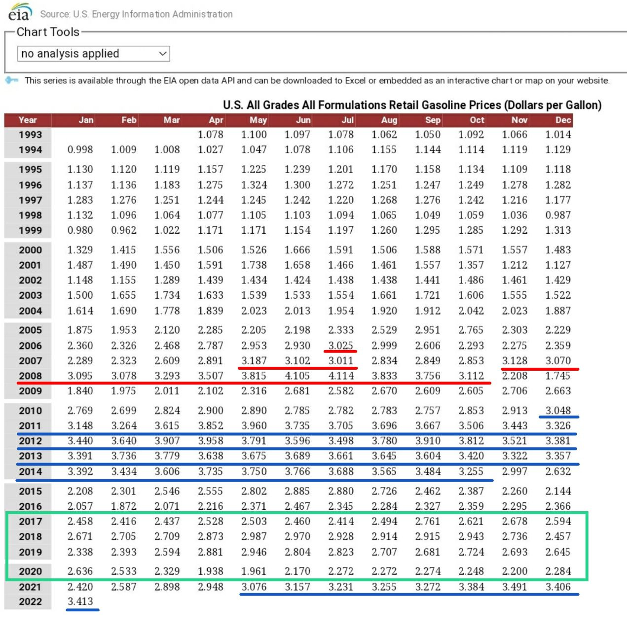 National Gas Average Prices since 1993. Every Month that the national gas average has been over $3/gallon: