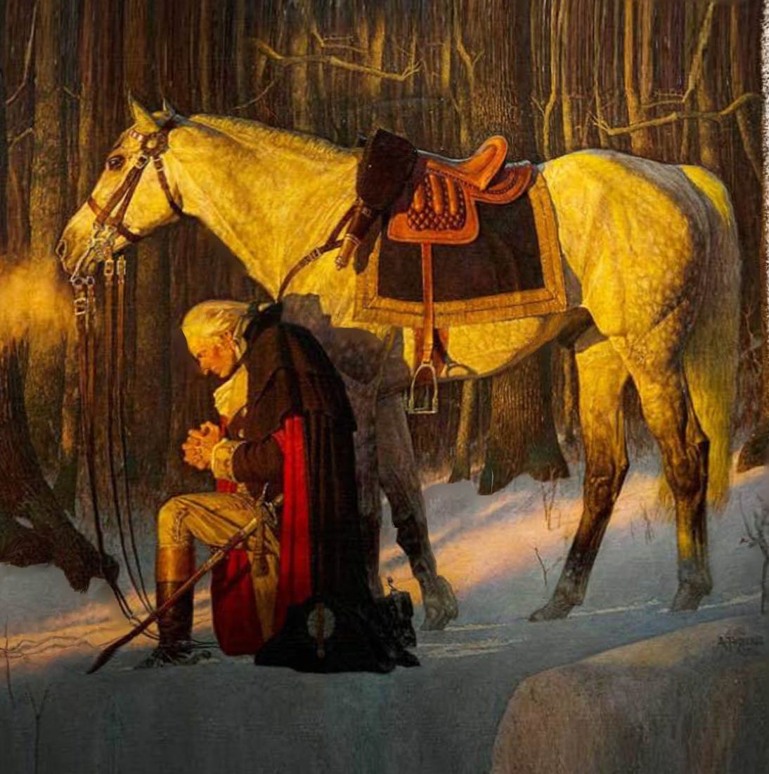George Washington at Valley Forge, Pennsylvania in prayer beside his horse Nelson at the Continental Army's encampment, during the terrible winter of 1777-1778.